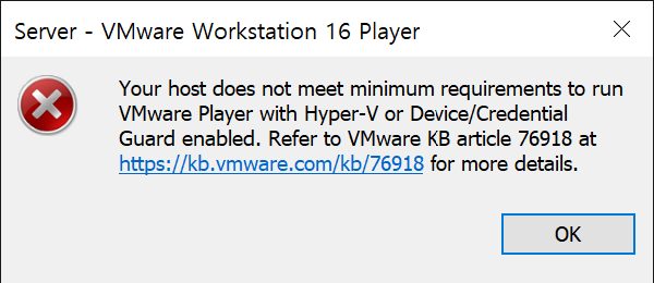 - WSL2 는 Hyper-v 라는 가상머신을 사용하는데, VMware를 사용할 경우, 가상머신간의 충돌이 일어나지 않을까? 라는 생각이 들었는데, 아니나 다를까 VMware 설치 후, Play virtual machine을 하니 다음과 같은 오류가 발생하였다.