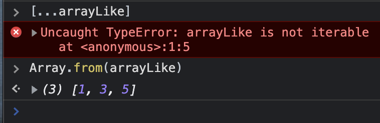 어떤 건 for 문이 되는데 스프레드 문법으로 형변환이 안되고, Array.from() 메서드로는 가능하고 대체 뭐가 되고 뭐는 안되는걸까요?