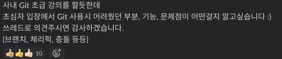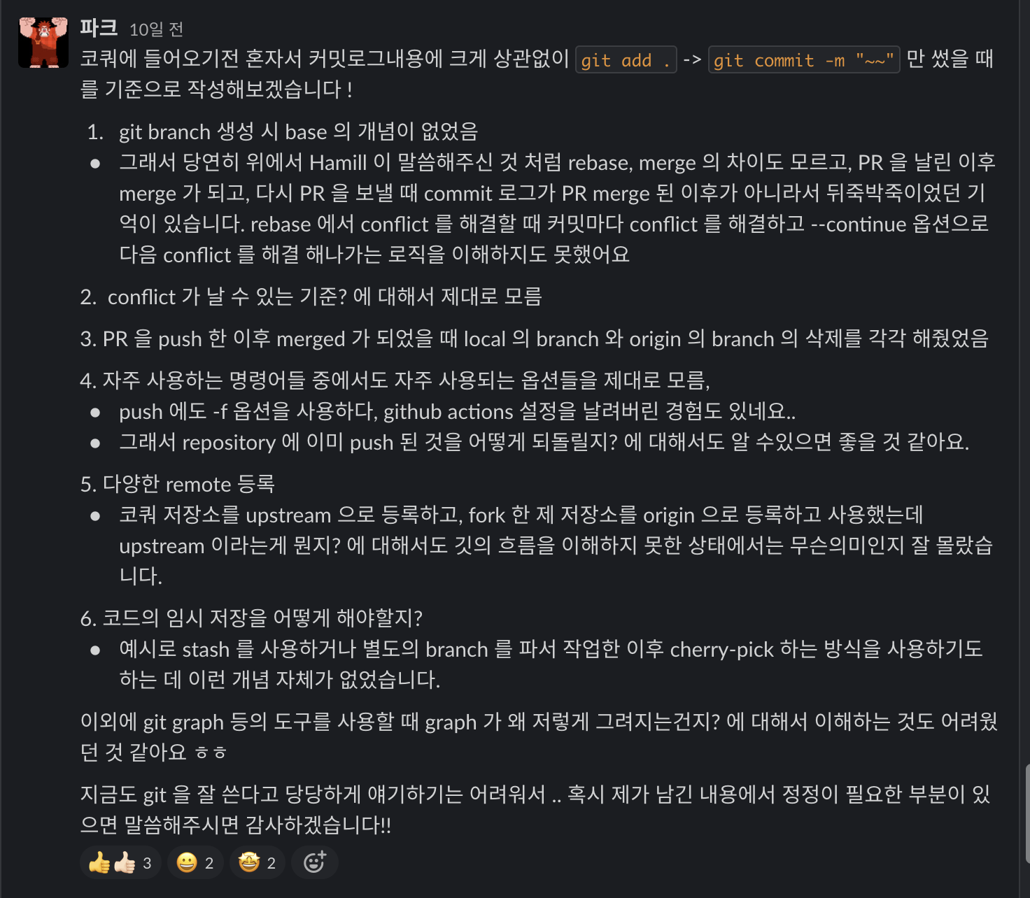 글을 작성하고 있는 지금은 그래도 깃을 사용할 때 어떻게 동작할지 예상이 되어서 GUI 의 도움없이 CLI 로만 git 을 다룰 수 있는 정도가 되었지만, 지금와서 생각해보면 이런 시행착오가 있었기에 가능한게 아닐까 싶다. 최근에 코드스쿼드 슬랙에서 사내에서 git 초급자를 대상으로 강연을 하신다는 분이 계셔서 내가 초보때는 어떤게 어려웠는지도 공유드렸다.
