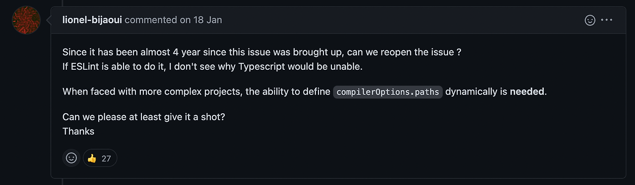 그런데 그렇게되면 하나의 path 가 추가될 때 마다 tsconfig.json, webpack.config.js, jest.config.js 세 곳에 모두 path 를 추가해줘야 하니 여간 귀찮은 일이 아니었다.
