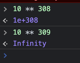 특정 부동소수점을 지날 때 정확한 숫자로 표현이 되지않는다는 점은 알았지만, 10의 309 승이 되었을 때 Infinity 가 된다는 것은 이번 기회에 알 수 있게 되었다.