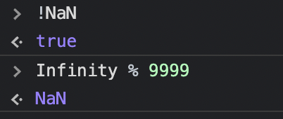 Infinity 를 나머지연산(%) 을 하려고 하면 NaN 이라는 falsy 한 값이 나온다.