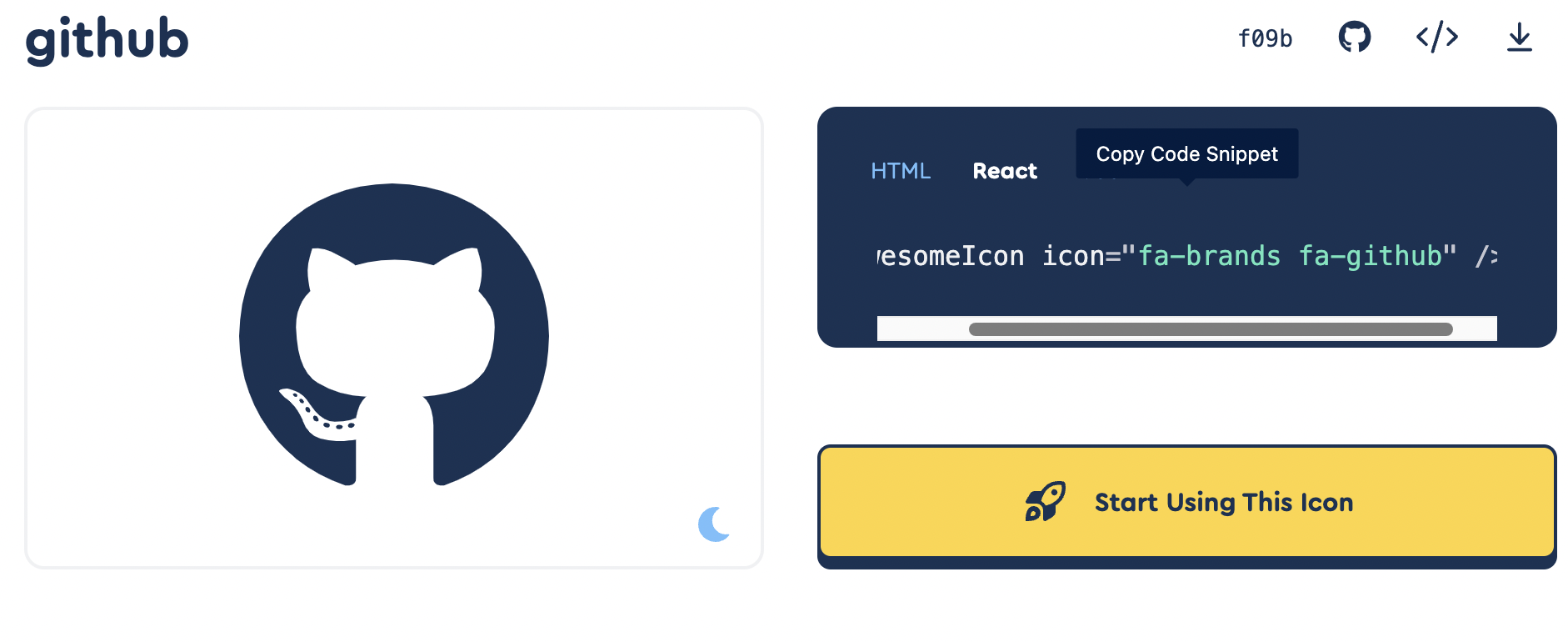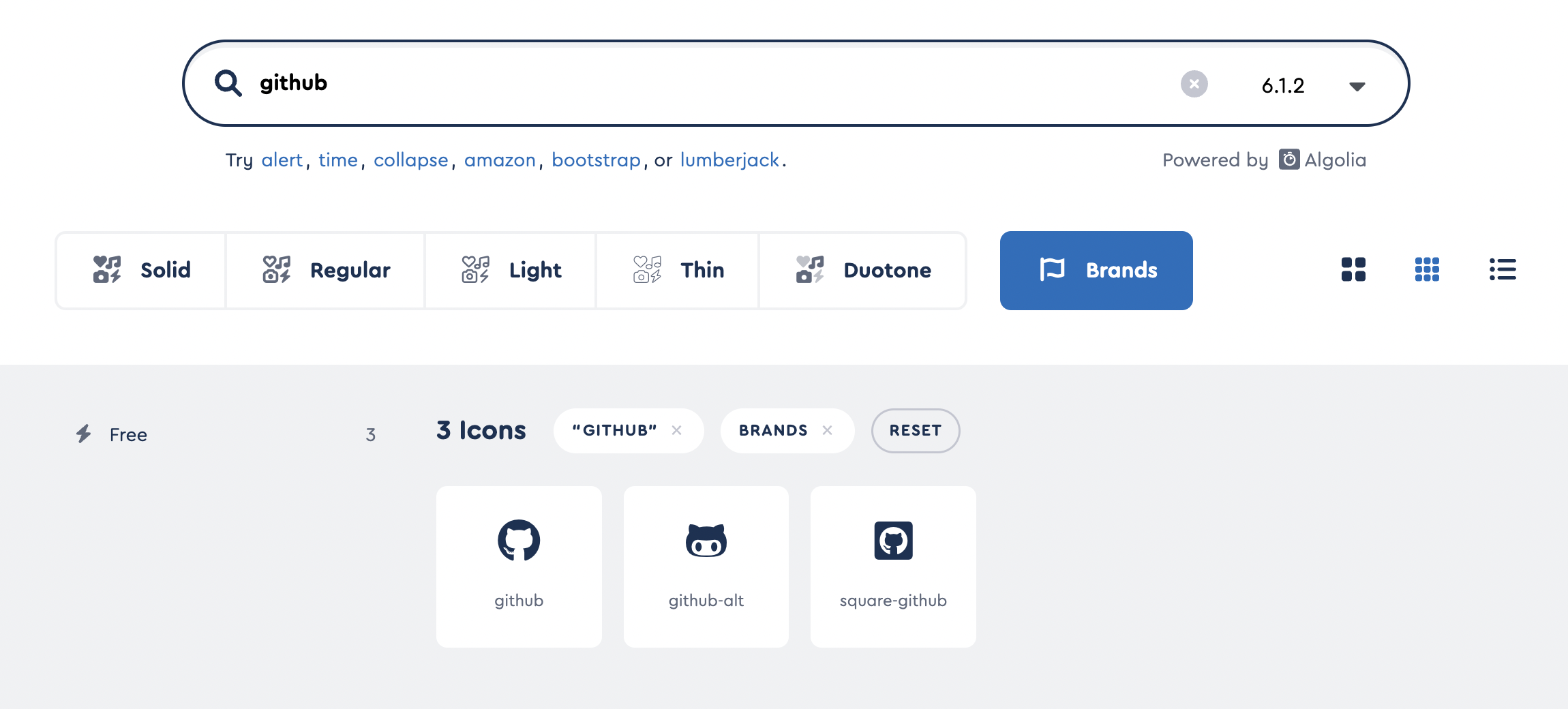 사용할 수 있는 Icon 을 골랐다면, 해당 Icon 이 어디에 속하는지 확인한 이후 ( github icon 은 brands 에 있음 -> fa-brands )