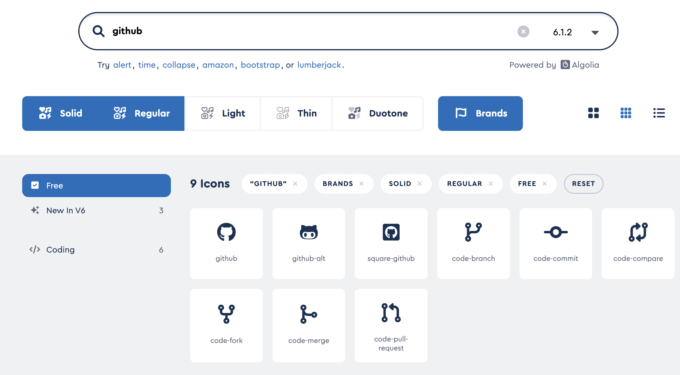 Font Awesome 의 홈페이지에서 Icon 을 검색합니다. 그러면 Solid, Regular, Light, Thin, Duotone, Brands 의 탭이 있는데