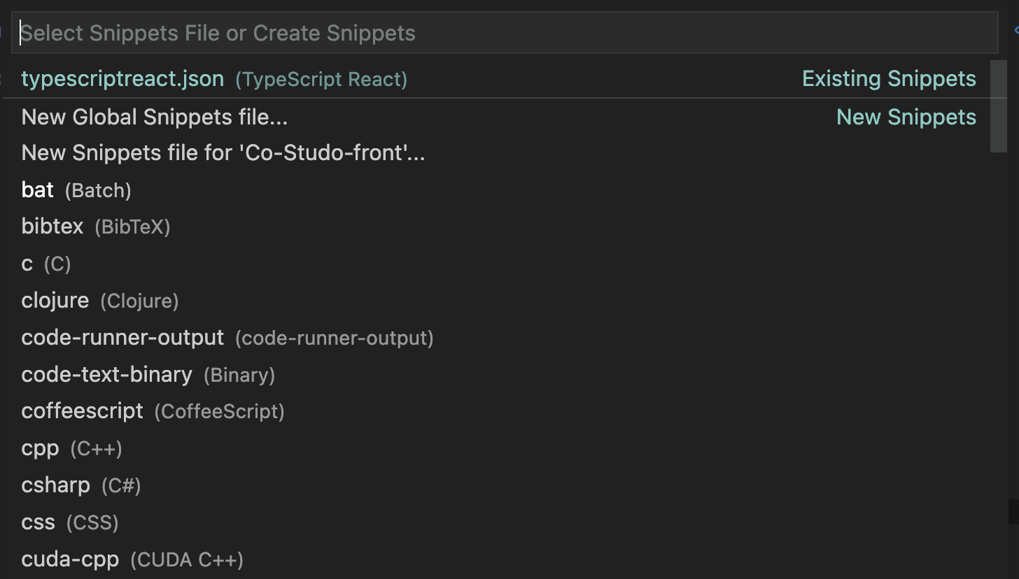 어느 확장자에 적용할 것인지 선택했을 때, 만약 typescript react 를 선택한다면 .tsx 파일 내부에서만 설정한 snippet 를 사용할 수 있습니다.