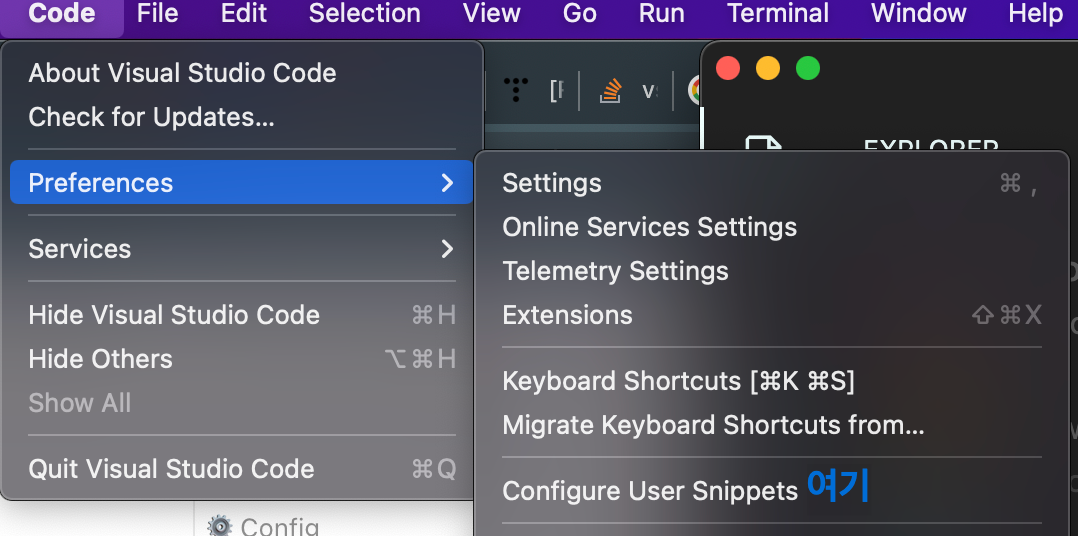 간단하게 VSC 를 실행한 이후, Code -> Preferences -> Configure User Snippets 로 실행하면 VSC 에서 어느 확장자에 적용할 것인지 확인한 이후 설정파일을 열어줍니다.